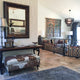 Ahhhh! Pattern, pattern, pattern! This is how you add pattern! Everywhere you look you'll see a happy marriage of color, shape and texture combined with unbelievable found objects and fabulous art. It all comes together to create this incredible eclectic mash up of a divine space. With its large open rooms, high ceilings and bold use of stone, this home could have felt cold and empty. By combining the right fabrics with the right pieces, it fills the space and adds warmth to the mix. This home is also a wonderful showcase for blended woods, both in color and in style... we beg of you, don't be afraid to mix woods and style! It's what keeps it looking specifically collected and chosen for a purpose, bought with intent, not as a set. This home, with its dark woods and leather could have easily looked too heavy, but with the style of the home itself, combined with the lightness and playfulness of some of the fabrics, and a well spaced floorplan that allows the rooms to breathe, the result is a warm, inviting equestrian retreat.